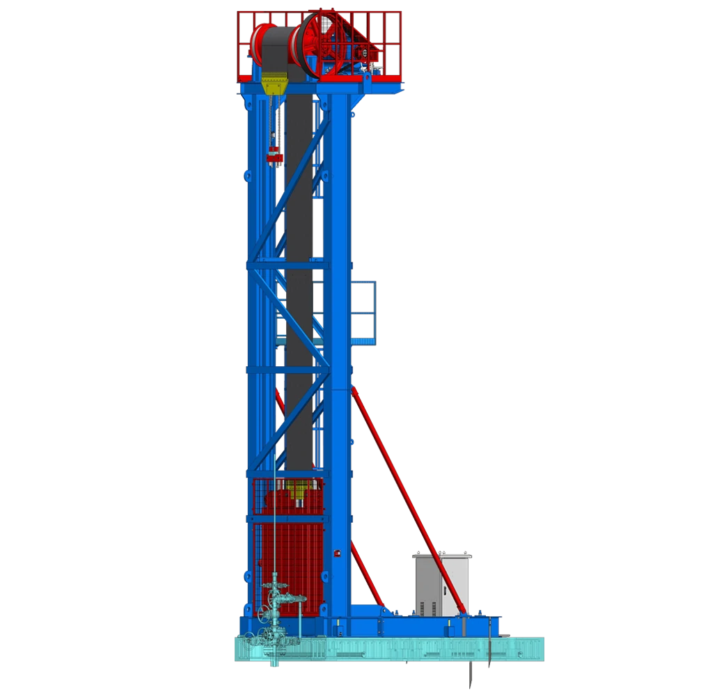 采用稳定的塔架式结构,通过交流变频技术控制永磁同步电机带动滚筒正反向转动,使披覆在滚筒上的负荷皮带在相互的摩擦力作用下,将滚筒的正反向转动转化成负荷皮带的垂直往复运动。负荷皮带的一端与平衡箱连接,另一端与光杆连接,带动光杆上下往复运动实现抽油泵抽汲油液。